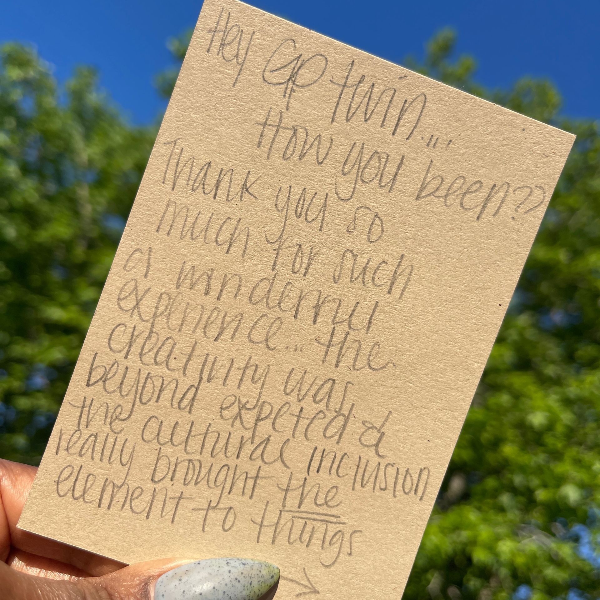 "I really appreciated that it was art with a purpose! We were fed in multiple ways, and everything was included. Thank you for a great experience."